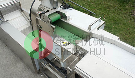 變頻調(diào)速切菜機(jī)與上層輸送帶無(wú)縫對(duì)接,按烹飪規(guī)格對(duì)物料進(jìn)行切割。