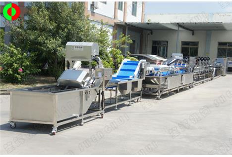大型蔬果分選清洗-風(fēng)干包裝加工生產(chǎn)線主要由預(yù)洗提升機(jī)-多工位分選臺(tái)-無(wú)損洗菜機(jī)-風(fēng)干線-枕式包裝線-金屬探測(cè)儀等設(shè)備組成蔬果深加工處理生產(chǎn)線。