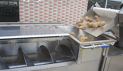 物料在清洗槽內(nèi)由螺旋葉向前推動(dòng),和毛刷摩擦接觸,并由機(jī)器上部的高壓噴嘴噴淋,從而達(dá)到連續(xù)清洗去皮的效果。