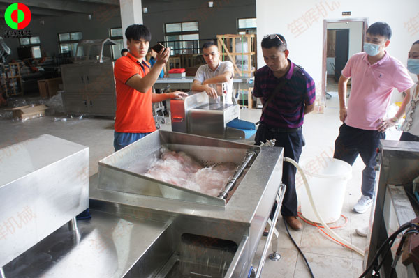 佛山某肉食品加工配送中心客戶一行人親臨我司測試訂購洗排骨機等設(shè)備!