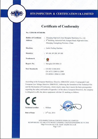 大蒜脫皮機獲得CE認(rèn)證