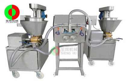 成型泵浦機(jī)主要是配合多功能成型機(jī)或者海螺丸成型機(jī)使用,主要祈禱填充、灌漿的功能。機(jī)器采用不銹鋼材料制造,符合衛(wèi)*生標(biāo)準(zhǔn)。合理的齒輪泵腔設(shè)計(jì)使 流量壓力大、灌漿穩(wěn)定,雙層保溫冷卻裝置,大容量冰鎮(zhèn)保溫層,使料斗漿體長(zhǎng)時(shí)間生產(chǎn)也保持新鮮不流失營(yíng)養(yǎng)。采用雙調(diào)速裝置,流量可調(diào)操作人性化,采用送料、泵體分別調(diào)速電機(jī)控制,可操控性高。本機(jī)配合各種功能型主機(jī)可靈活運(yùn)用于各種產(chǎn)品成型,快裝式結(jié)構(gòu)更加突出生產(chǎn)應(yīng)變,是生產(chǎn)冷凍調(diào)理食品的理想設(shè)備。 本機(jī)還可灌制夾心香腸、熱狗腸、鮑魚(yú)片等產(chǎn)品。適合肉制品加工廠、速凍食品加工廠等單位使用。